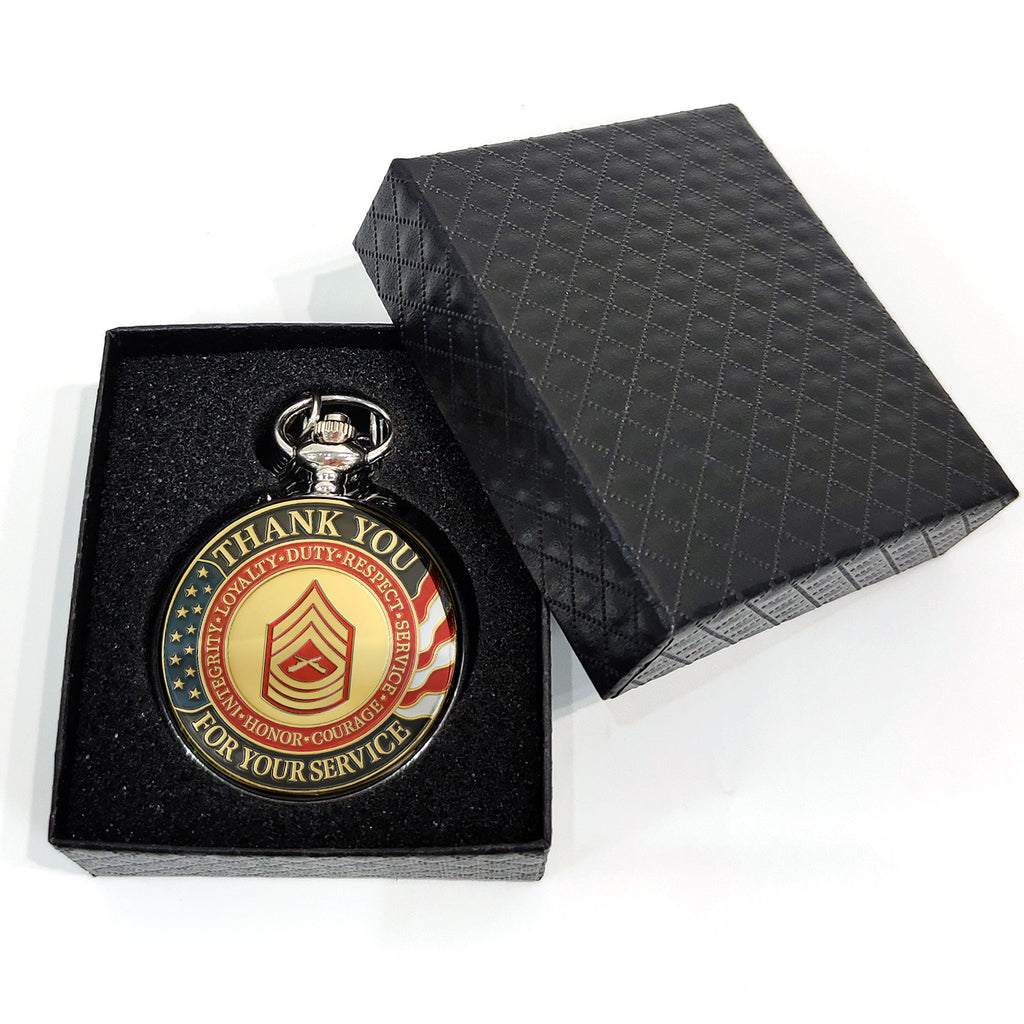 Honor the dedication and sacrifice of a United States Marine with this meaningful “Thank You for Your Service” Pocket Watch. Designed especially for USMC veterans and active-duty Marines, this timepiece features a bold 3D-style printed Marine Corps rank insignia at the center, surrounded by powerful core values: Integrity, Loyalty, Duty, Respect, Service, Honor, and Courage. The background proudly displays the American flag — a lasting symbol of freedom and faithfulness.